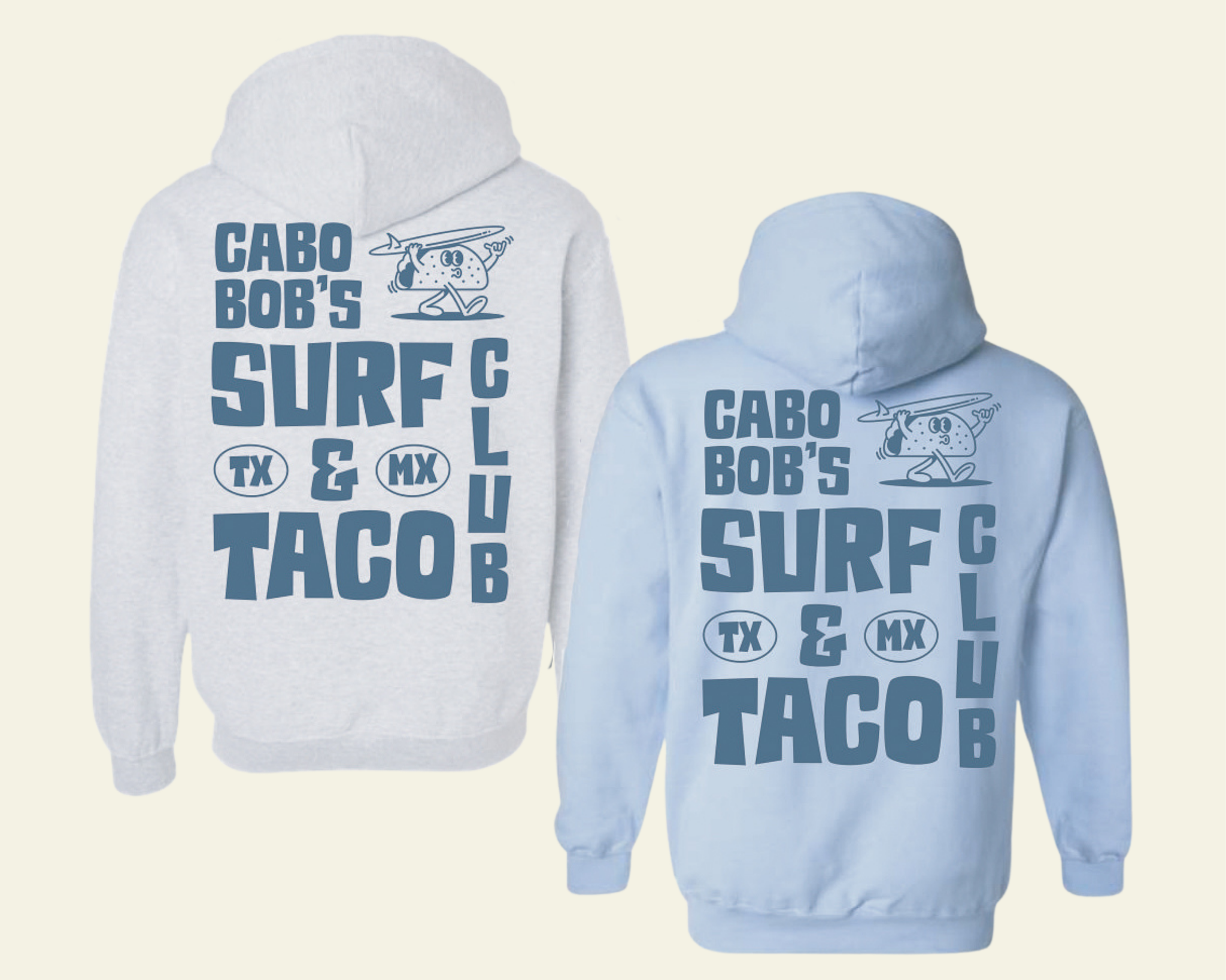 Our fan-favorite "Surf & Taco Club" design printed in blue on a super soft Hanes Unisex Ecosmart® Pullover Hooded Sweatshirt.